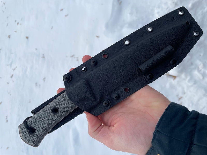The Sabre ground 6.5in blade is 60HRC and gives tremendous bite, the balance and handling of the knife is excellent and the textured solid Micarta slabs are tough and grippy. Typically seen on smaller knives, ELMAX is an outstanding steel in terms of strength, edge holding and corrosion resistance, its one of the best choices for an outdoor knife and in the Apocalypse you have a lot of it!.