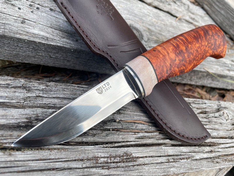 Stick Tang to keep the weight down, the handle fully encloses the Tang with its body of Dyed Curly Birch and Reindeer Antler, capped with a Stainless Ferrule.