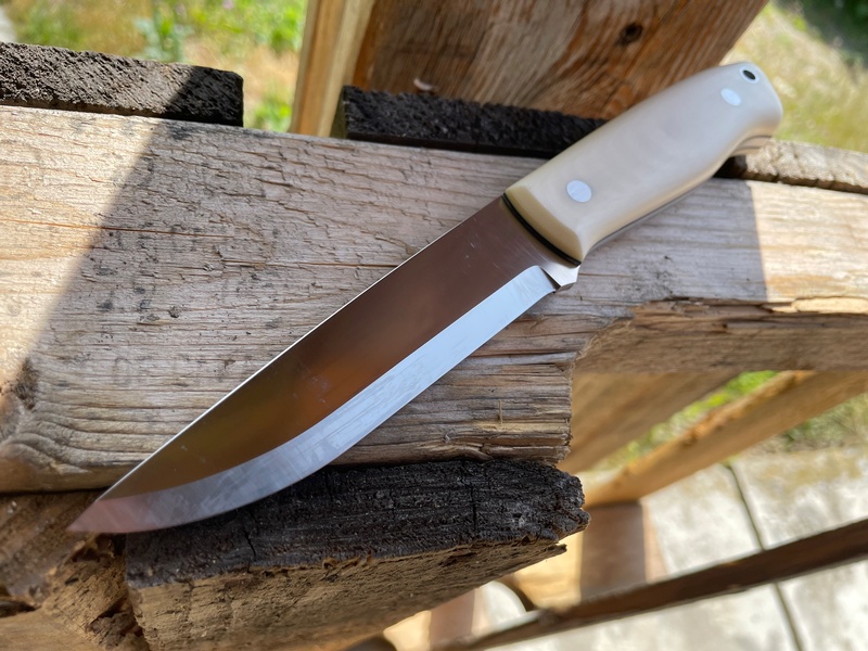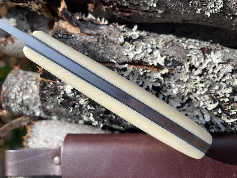 This Trapper is in the ELMAX Steel (60-62 HRC) zero scani grind, comes with leather scandi style dangler sheath.
