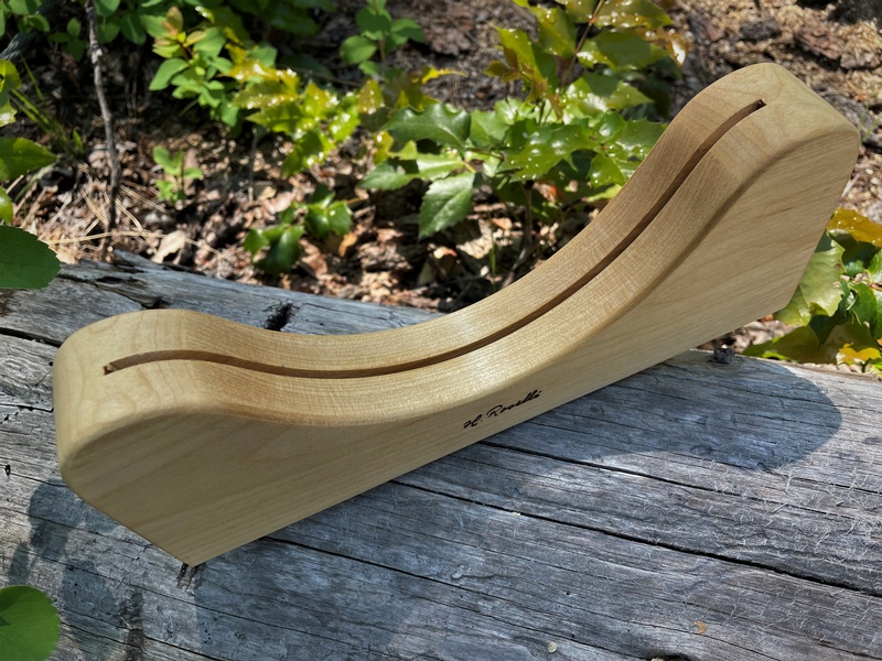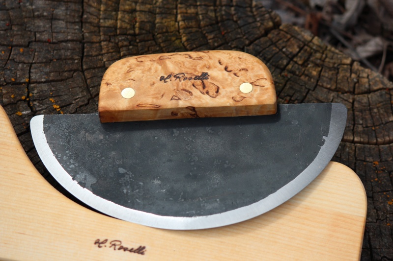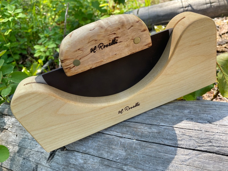 This one is high grade curly birch, with forged carbon steel blade and brass rivets. Comes with birch holder.