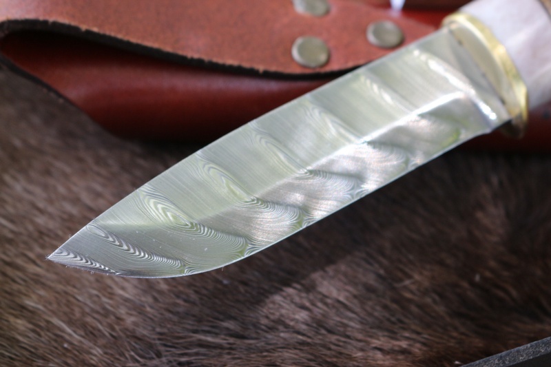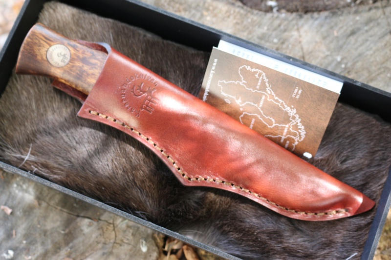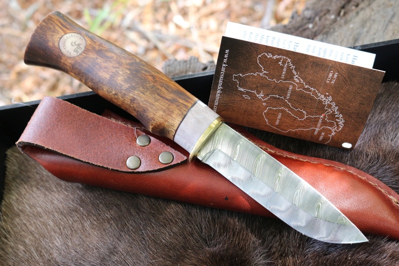 RWL34 160 layer damascus steel, scandi grind. Handle curly birch and moose bone, sheath is friction fit leather. Comes in presentation box.