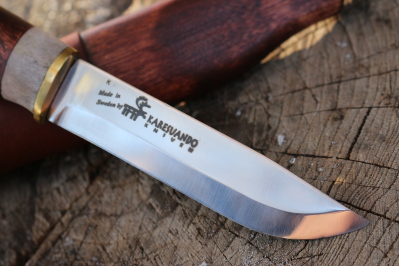 Made by Karesuando Kniven, a small knife company in Swedish Lappland, who make traditional, quality outdoor knives. This is the Kebne, a curly birch handled Scandinavian style hunting and outdoor knife, made in the traditional manner with narrow tang, local wood and Moose bone with a brass fitting and uses the Swedish 12C27 stainless steel, scandi ground.