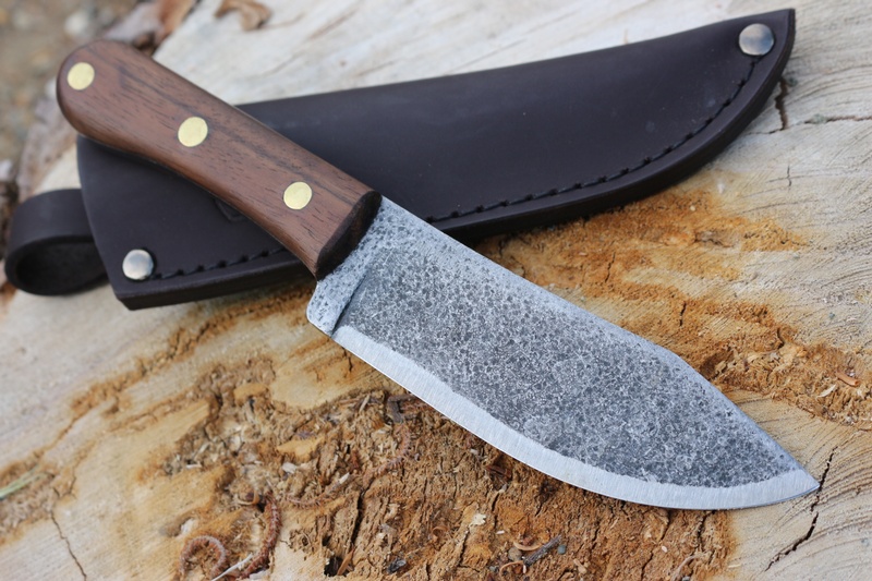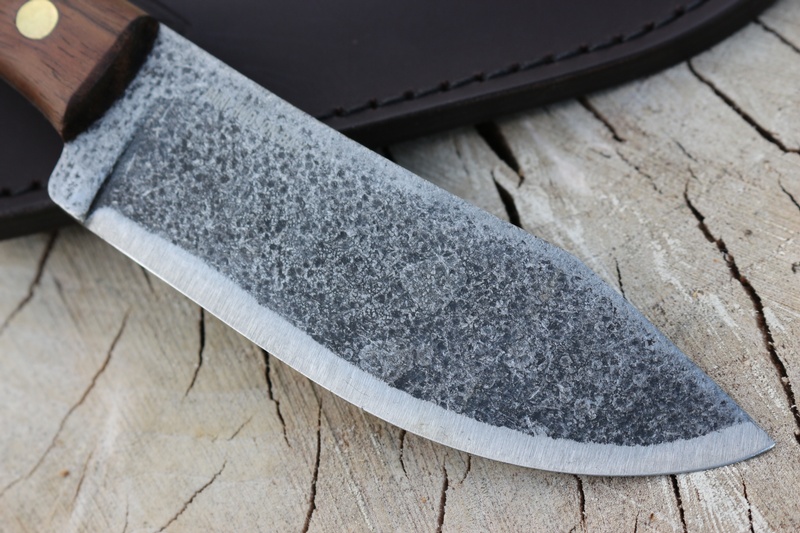 Full broad tang with brass pins and Walnut slabs, the knife is solid and well made. It uses the same 10785 High Carbon Steel of the original and is scandi ground.