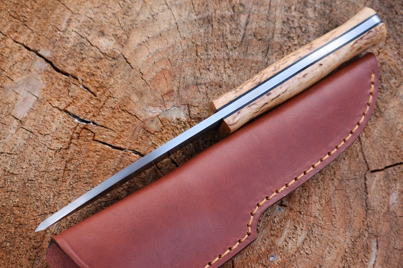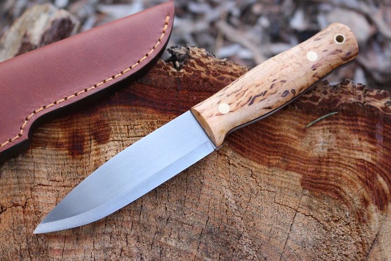 The 'Lars' is a great combination of beauty and utility, with its excellent Curly Birch Handle (Black liners) and clean lines it looks like its wanting a job to do, while the superb Scandi Ground Bohler Sleipner Steel, looks like it could do it!.