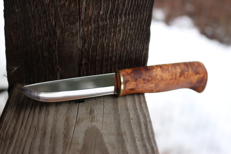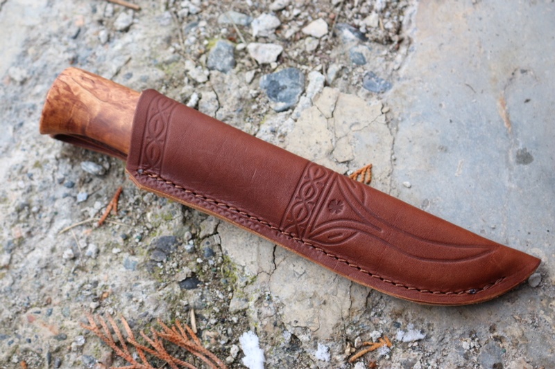 The rich locally sourced Curly Birch handle is stained a Deep Brown and provides a secure and comfortable grip, the business end is 4in Swedish Stainless Steel with scandi ground edge @57HRC.