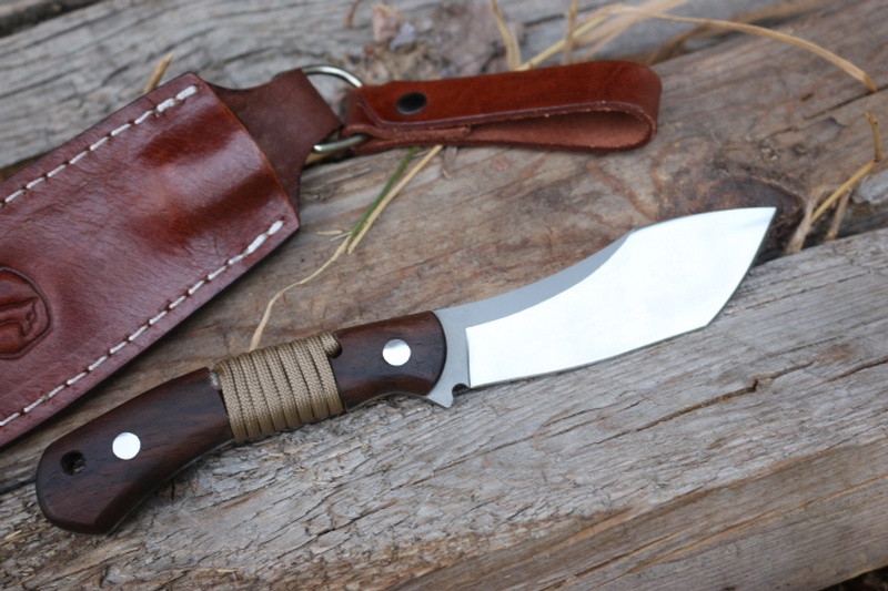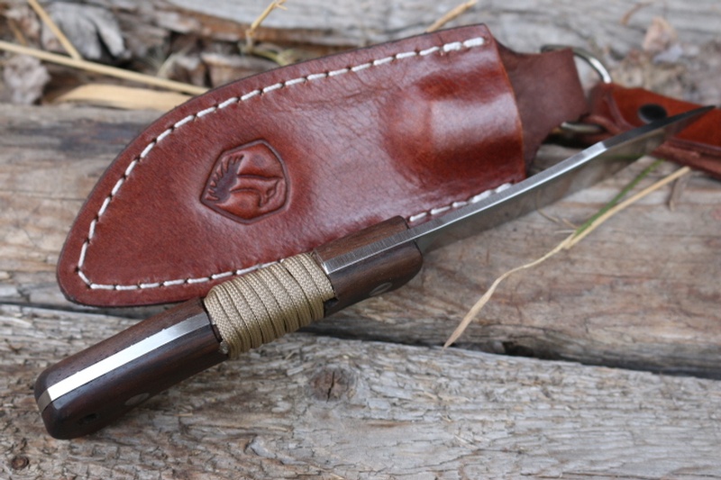 The Knife is Full Broad Tang with Walnut Slabs that are machined with a gap for Paracord wrap and two Stainless Pins.