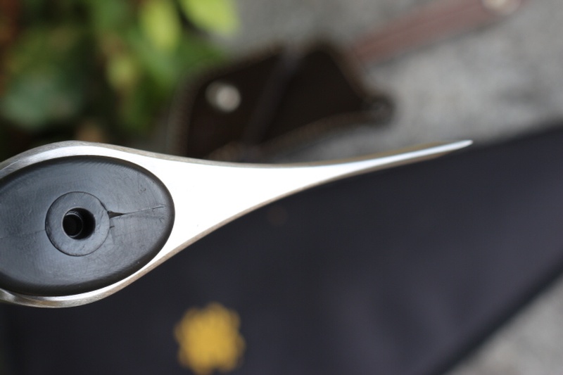 When not in use, the HatchetHawk and its owner are protected by a handcrafted heavy leather sheath with a snap-fastened leather strap. A loop on the back of the sheath allows convenient belt carry, while grommets in the sheath body will accept a cord or strap for over-the-shoulder carry like a classic baldric.