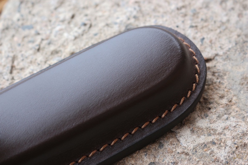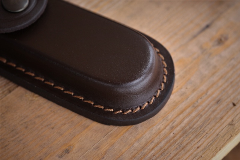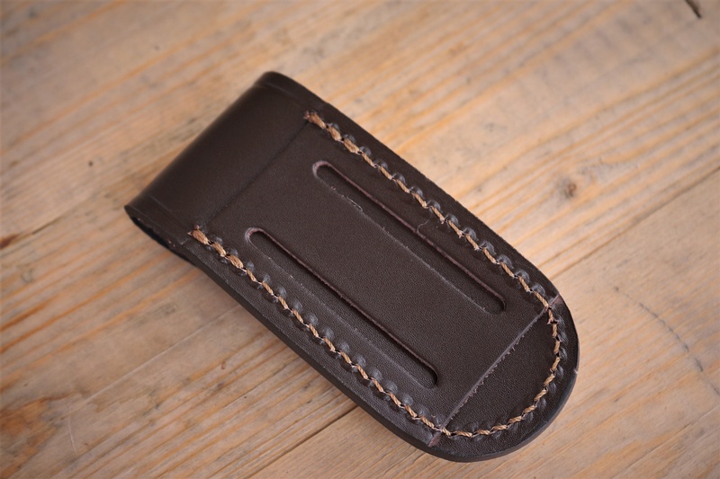 A simple and practical little knife pouch, good quality leather, nice stiching and a reliable snap on clip.