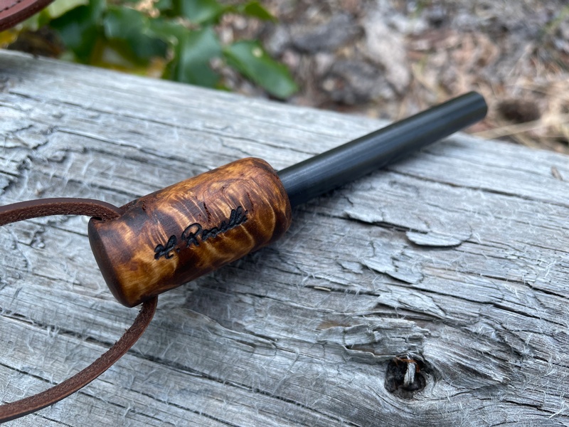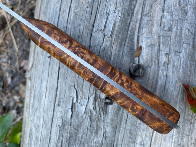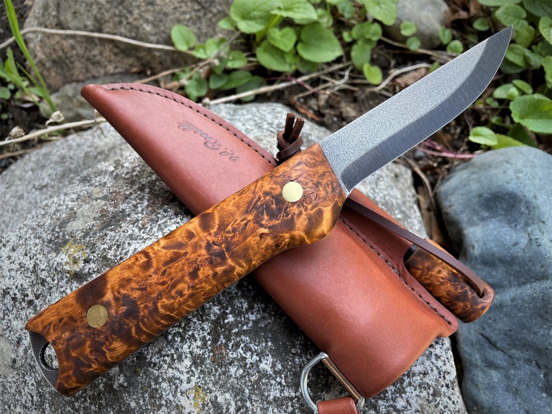 The knife has a beautiful handle in stained curly birch, which makes you just have to have it! - coated with linseed oil to ensure a firm grip, even when wet. The handle also has brass clamps and holes for straps.
