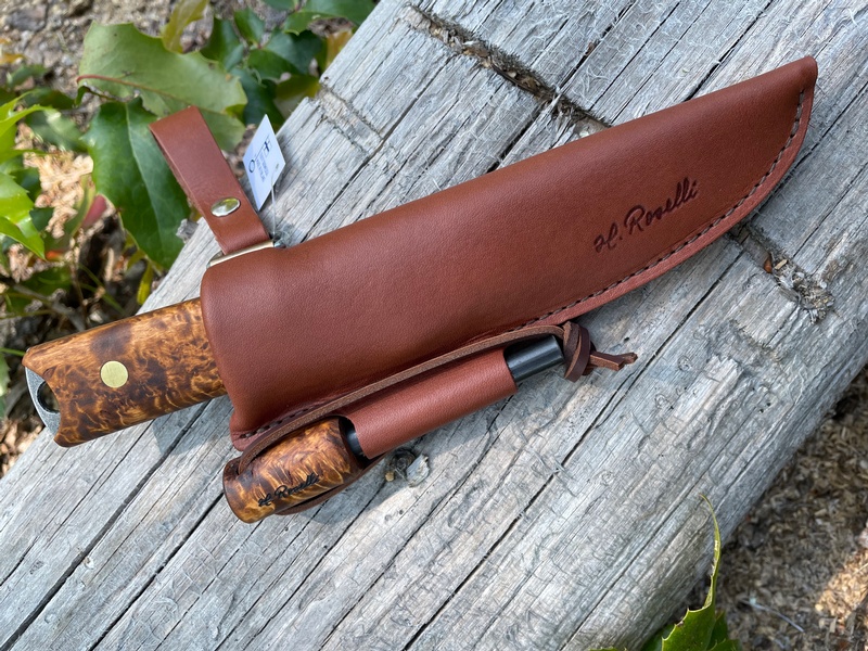 Comes in a handmade sheath of dark vegetable tanned Finnish leather, with a metal spring to always keep the knife securely in place.