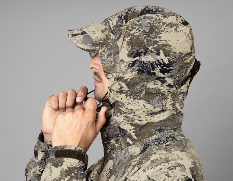 A jacket that is specially designed for mountain hunting where you want optimum breathability and good protection from the cold wind, rain or snow. The camouflage pattern is AXIS MSP® MOUNTAIN which will help you blend into the terrain. The jacket has an integral hood, a soft collar lining, and a vertical radio pocket on the chest. The entire jacket packs into its own left pocket.