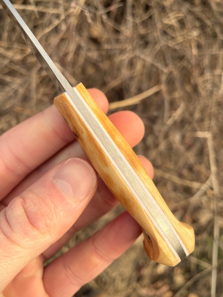 Whereas the standard Mandra's scandi grind performs well for mosts tasks, the Mandra FG excels at slicing. Whether you are harvesting mushrooms or slicing them up on your cutting board, the new Mandra FG's 12C27 blade will make sure that you cut clean and cut good. Although the same shape, it has a slightly thicker handle than the standard Mandra because the white liners are thicker. This creates a very balanced blade that you can work with over time.