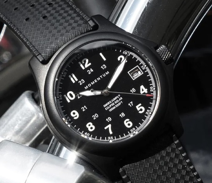 The Smokejumper Eclipse Solar features an ultra-lightweight black-ion coated titanium case. The Japanese solar-powered movement makes this watch virtually maintenance-free, and results in fewer batteries ending up in landfills. A screw-down crown ensures water-resistance of 100m. The perfect watch for when you want to fly under the radar.