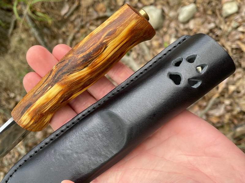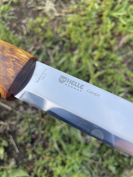 A slightly larger and thicker bladed outdoor knife from Helle of Norway, the blade is the 3.1mm thick 12c27. Nice Curly birch handle is contoured for good grip and constructed in the traditional stick tang fashion