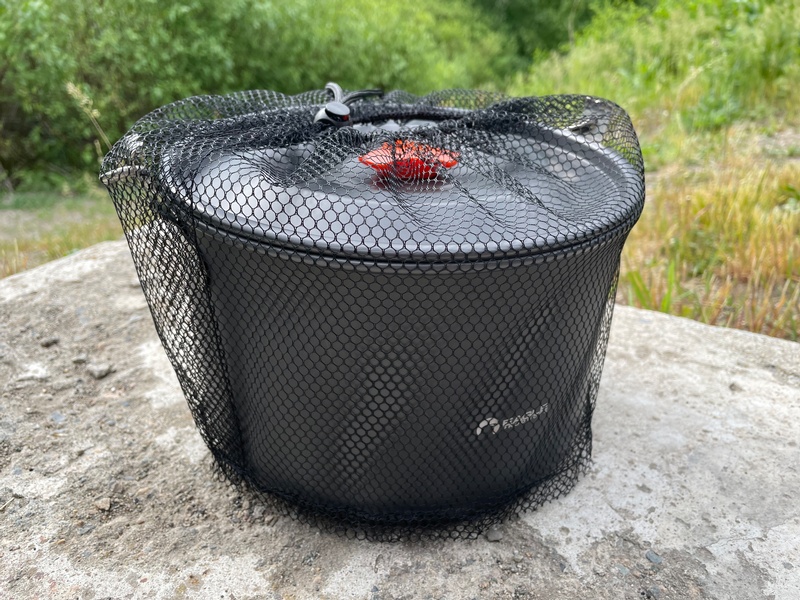 Made of anodized aluminum so super lightweight and strong! Perfect if you want a do it all pot, The handle is Stainless Steel. It includes a black mesh bag for transport.