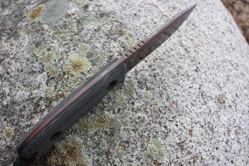 Full flat ground, with fine secondary bevel, the 60HRC blade is 4.5mm thick, jimped and tapered to the tip. The capped raised spine shows the mark of an experienced maker and the knife is a pleasure to use.