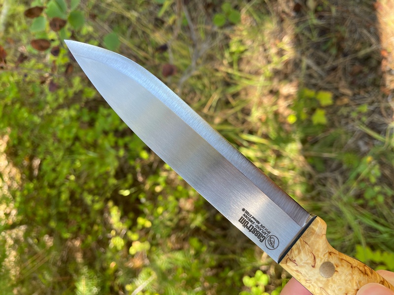 - Scandinavian grind, along with the steel properties, makes the knife robust, effective for wood carving, and easy to sharpen in the outdoors.