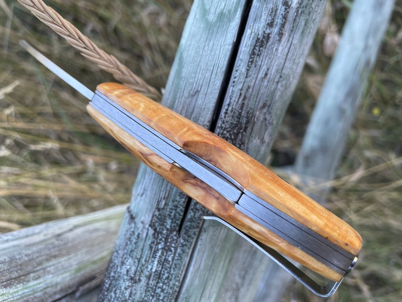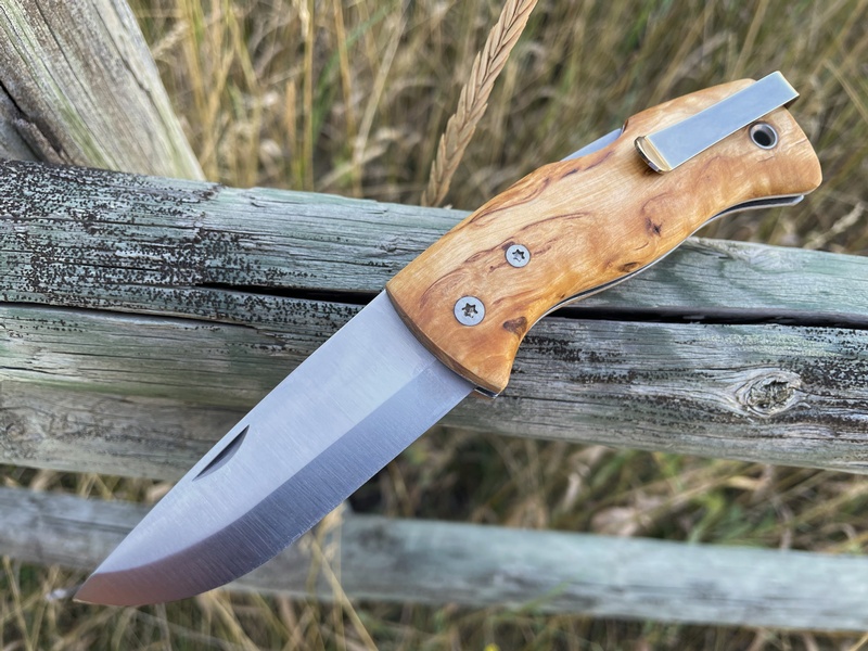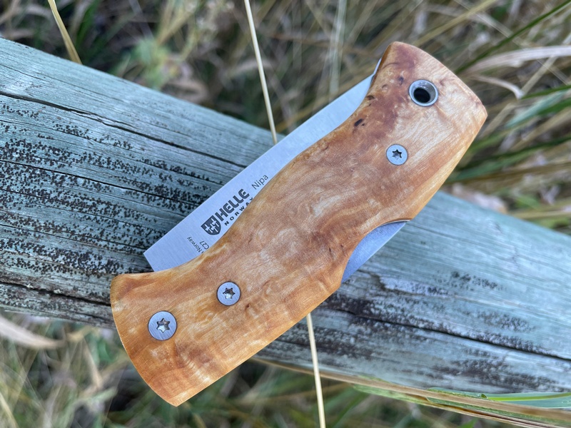 The Nipa is built off the classic EDC folding knife named the Kletten. A slightly bigger version with hand sanded curly birch wooden handle, durable and made to be used.