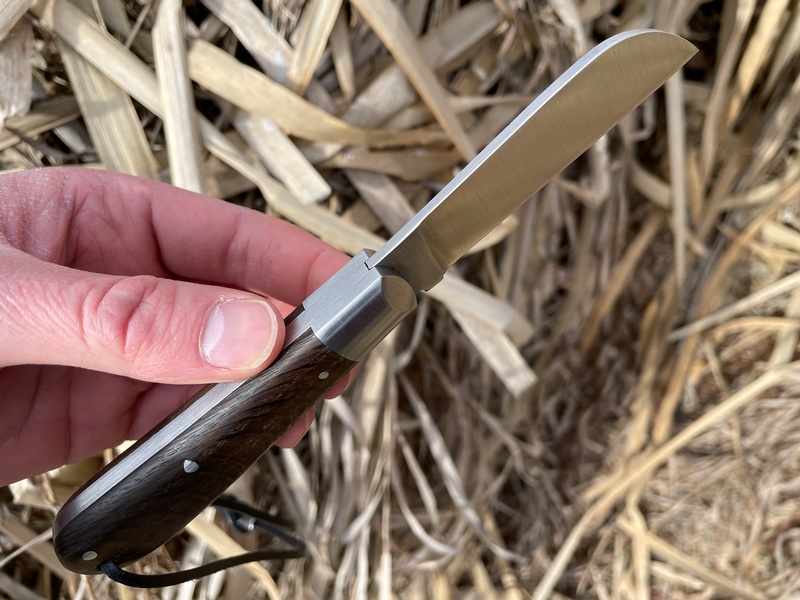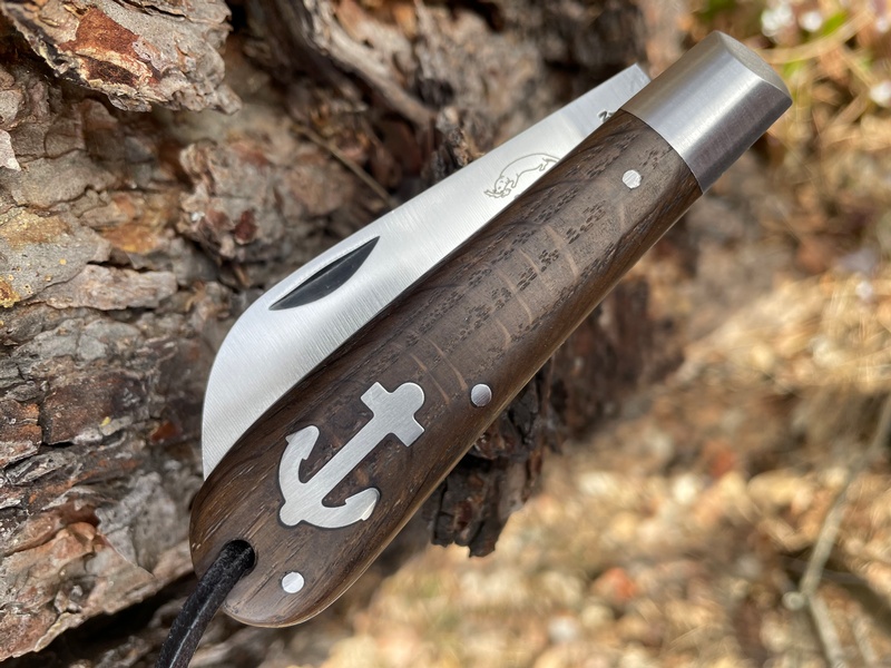 The anchor knife from OTTER impresses with its combination of functionality and timeless elegance. A highlight is the stainless steel anchor embedded in the elegant wooden handle, which forms a stylish contrast with the dark wood scales. The ergonomic handle has a practical hole for a lanyard, simplifying transport. The hoof blade is optimized for slicing cuts. This variant is the large version of our popular anchor knife.