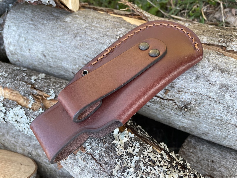 A simple and practical little knife pouch, good quality leather, nice stiching and a reliable snap on clip.