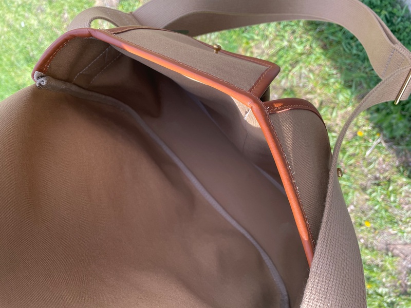 A brass ring is also fixed to the outside of the bag, many people wonder why this is, well the original Brady Ariel Trout fishing bags had this ring featured as a way to secure a fisherman's landing net a method that is still used today. The bag also has a wide webbing adjustable strap which is securely attached to the bag with wide leather side panels.