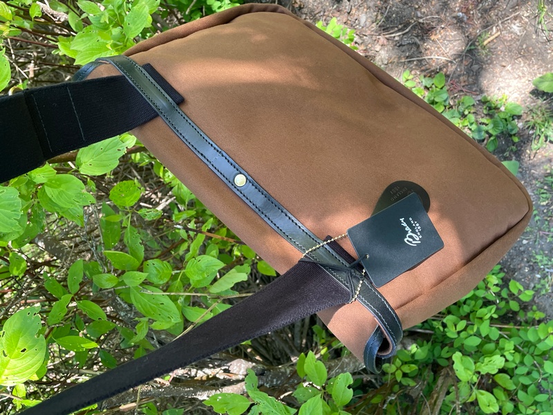 The top edge is reinforced with a wide leather strip which securely attaches the adjustable webbing strap to the back of the bag, allowing the user to comfortably sling the bag across the body should they wish.