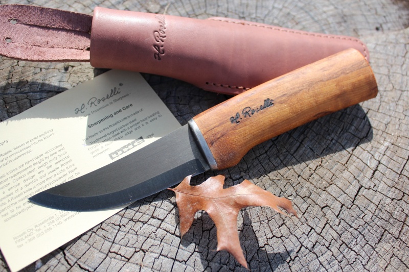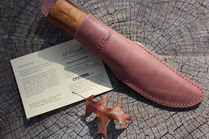 UHC-steel holds its edge longer. The handles of UHC-knives are made of birch, kiln dried and stained, to ensure a good grip. A strongly constructed leather stealth is a feature of each Roselli knife.