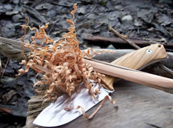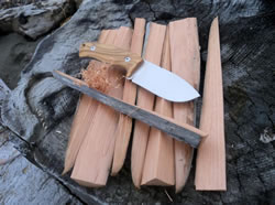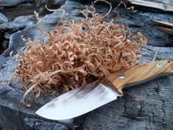 Making feather-sticks from different kind of wood is an important part of fire preparation and I think it is an excellent practice to get a feel of the blade. This task was very easily accomplished with the help of the sharp, full flat grind blade. I have made a few pictures of some of these nice, thin and curly feather-sticks.