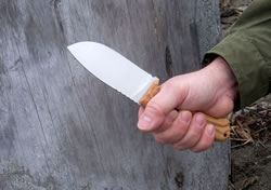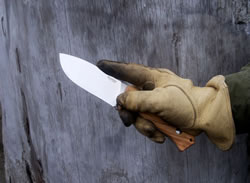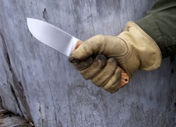 The fit and finish on this midsized knife (and its sheath) is superb. Excellent workmanship and quality is written all over it. This was obvious as soon as I handled it. The knife feels good in the hand, it has good balance and a good heft without being too heavy. It is stout, robustly built and it has a full broad tang construction. The balance point of the knife is just about at the first screw in the handle. The olive wood (Santos wood and black Micarta is available as well) handle panels are fastened by Torx T8 stainless steel screws and have a nice surface texture done with a 3D milling machine. This generously sized handle has a lanyard hole, palm-swells, integrated finger-guard and a very ergonomic shape, all of which provide a comfortable and secure hold. Here are a few "in hand" photos with and without gloves in various grips.