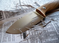 This German made stainless steel is gaining popularity among knife-manufacturers, especially in Europe. It has very fine grain, good resilience and D2 like wear resistance.
